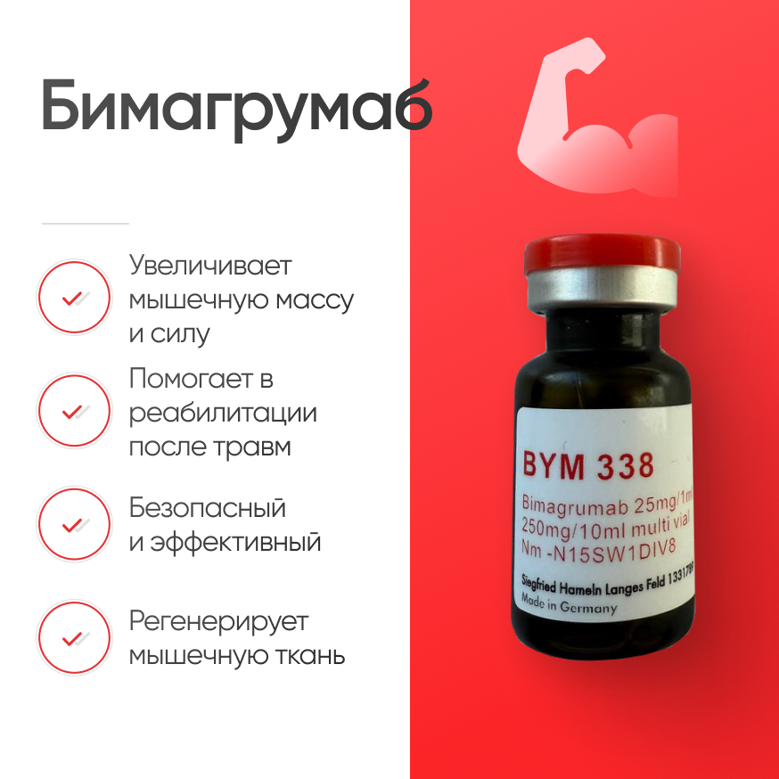 Препарат Bimagrumab полностью человеческое антитело. Это минимизирует риск иммуногенности и повышает безопасность при длительном использовании. Клинические исследования BYM338 демонстрируют, что он эффективен, когда необходимо повысить мышечную силу и улучшить физический статус пациентов.