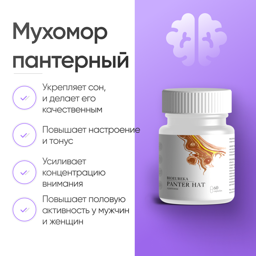 Назначение средства Мухомор пантерный 60 капс состоит в усилении функций мозга, улучшении параметров деятельности жизненно важных органов. Активные вещества, находящиеся в шляпках мухоморов, усиливают энергообмен, отлично повышают защитные свойства организма. Микродозинг Мухомора pantherina оказывает благотворное воздействие на организм, а также: